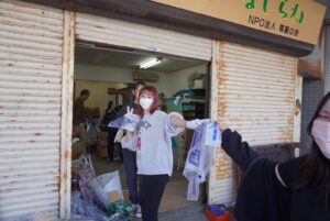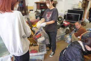 写真(左)=学生は先生方の指導の下、交代でゴミ片づけをしてくれています (右)ゴミの量が半端ではないので軽トラックで焼却場に何度も運び出します