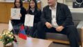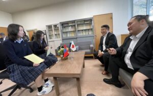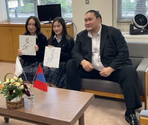写真(左)=10月3日には同郷の縁で伊勢ヶ浜親方(元横綱・照ノ富士)が青陵高校のモンゴル人留学生を激励にきてくれました (右)=留学生は色紙にサインをしてもらい感激していました